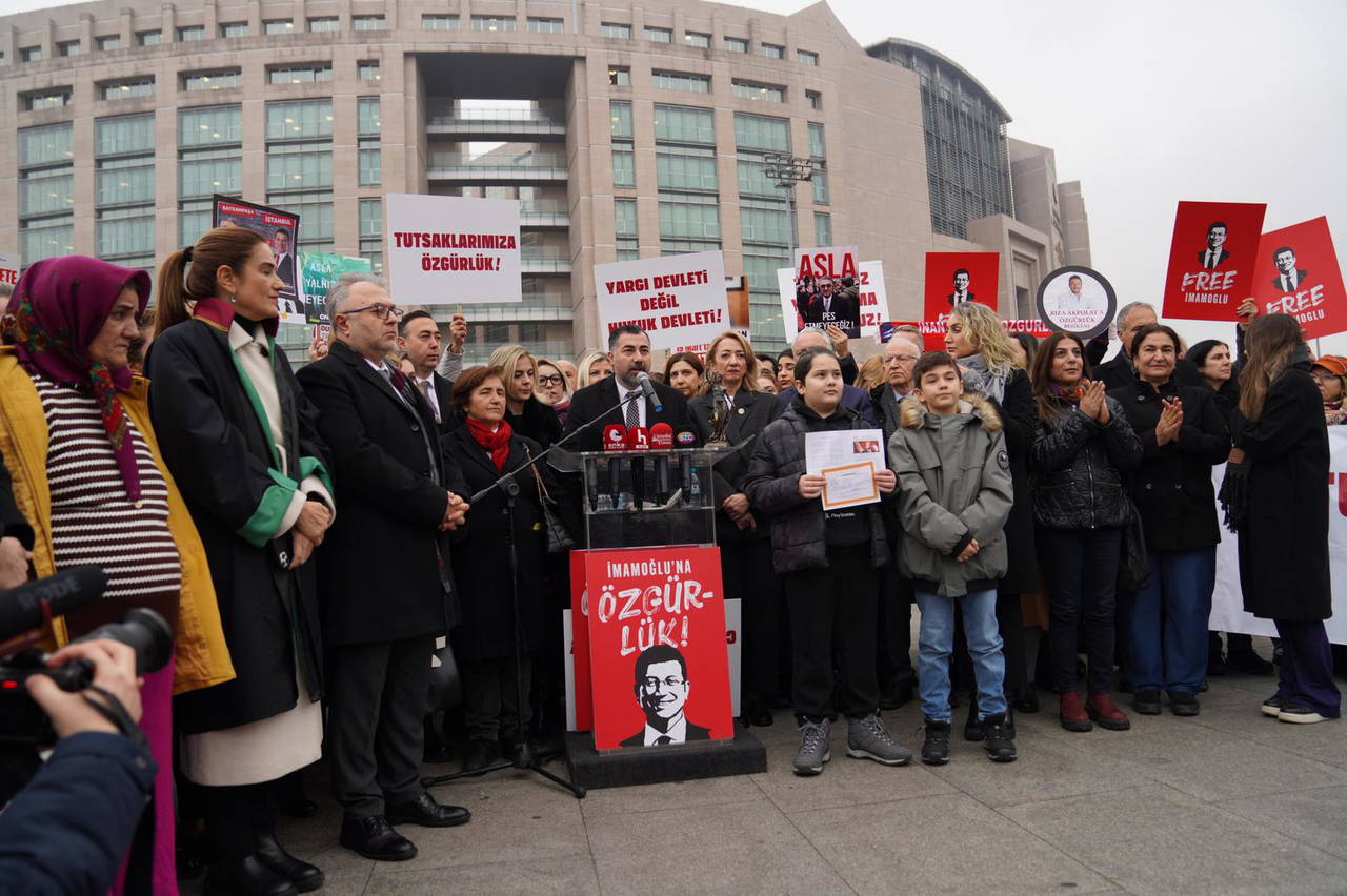 Kürsüye koyduğu Themis heykeli önünde konuşan İmamoğlu, adaletin kozmik unsurlarından uzaklaşıldığını vurgulayarak, “Avrupa’nın değil, dünyanın en büyük mahkeme salonunu da inşa etseniz, adil bir yargılama yürütmedikçe her yer size dar gelecek. Milletin vicdanı saraylara sığmaz” dedi.