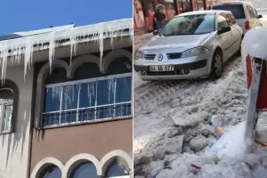 Çatılardan sızan suların donmasıyla kaldırımlar ve yol kenarlarındaki çöp kovaları büsbütün buzla kaplandı. Birtakım şoförler araçlarını branda ve naylonlarla sardı.