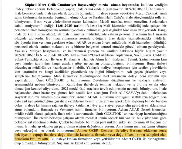 17.07.2025 tarihli eksper raporunda ihaleye fesat karıştırma hareketinin tek bir hareket olarak yer aldığını söyleyen Burak Sırali, “Burada Aziz İhsan Aktaş ile bilgi paylaşıldığı ileri sürülmektedir. Bir el yazısı notunun, İsmail İtimat aracılığıyla Aziz İhsan Aktaş’a iletilerek yaklaşık maliyetin gönderildiği belirtiliyor. Fakat not bana ilişkin değildir. Avukatım aracılığıyla uzmana bu notun fotoğrafını götürdük ve el yazısının bana ilişkin olmadığını tespit etti. Yani kendimi bu hususta daha nasıl savunabilirim bilmiyorum” dedi.