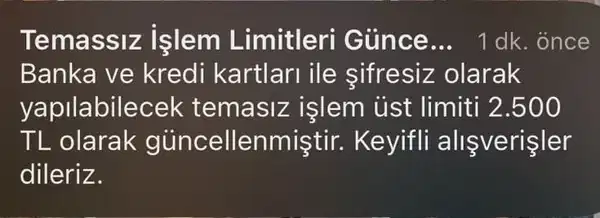 Düzenlemeyle ilgili olarak bankalar, müşterilerine bilgilendirme iletileri göndermeye başladı. Bankacılık kaynakları, temassız ödeme limitine ait bilgilendirmelerin kademeli olarak devam edeceğini belirtiyor.