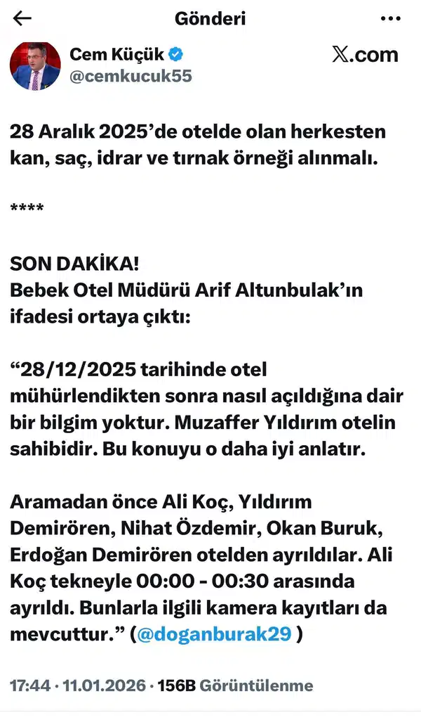 İktidara yakınlığıyla bilinen Cem Küçük, toplumsal medyadan yaptığı paylaşımda, 28 Aralık 2025’te otelde bulunan herkesten kan, saç, idrar ve tırnak örneği alınması gerektiğini savundu.