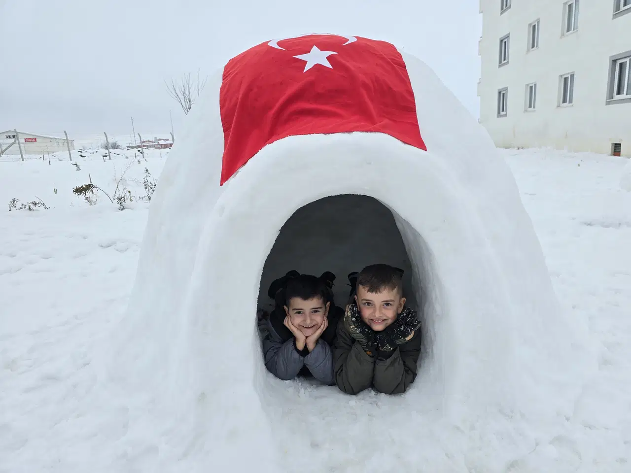 Yunus Ersoy ise “Kartopunu yuvarlaya yuvarlaya yaptık. İçine giriyorum. İçi hoş, sıcak. Kamp lambası getirdik. Işık olmadığı için içine koyduk. Diğer çocuklara ‘Sizinle bu türlü bir konut yapalım mı?’ derim” biçiminde konuştu.