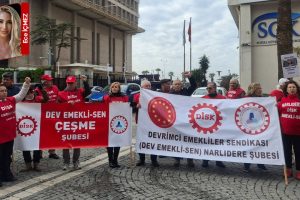 DİSK Devrimci Emekliler Sendikası İzmir Şubeleri, CHP’nin TBMM’de devam eden nöbetine takviye için SGK İzmir İl Müdürlüğü önünde basın açıklaması yaptı. Açıklama sırasında sık sık “AKP, artırımları al başına çal“, “Gün gelecek devran dönecek AKP halka hesap verecek” sloganları atıldı. Devrimci Emekliler Sendikası Ege bölge temsilcisi Hasan Özkaynak, 2026 bütçesinde emeklilere ayrılan hisseye sert sözlerle reaksiyon gösterdi. Özkaynak, emeklilerin sadakaya değil, insanca hayat hakkına muhtaçlığı olduğunu vurgulayarak, iktidarın bütçe tercihlerinin sınıfsal bir hücum olduğunu söyledi.
