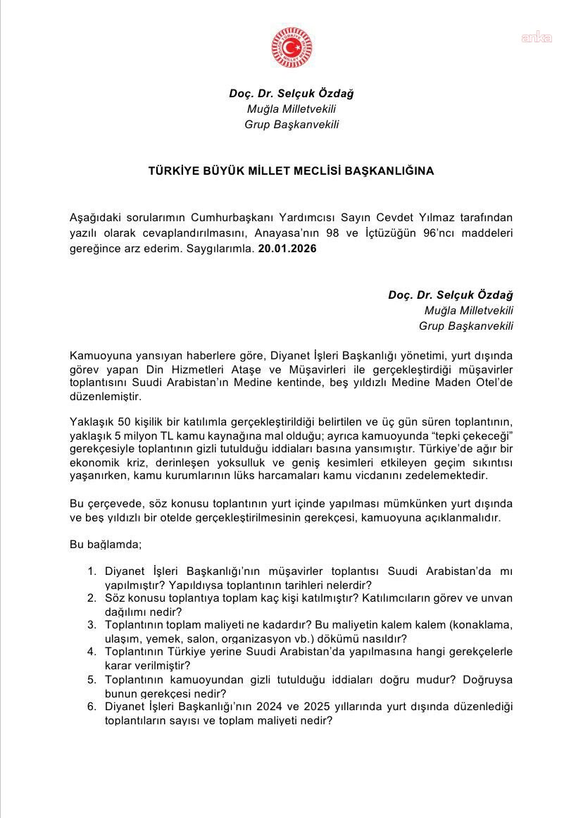 “Diyanet İşleri Başkanlığı’nın müşavirler toplantısı Suudi Arabistan’da mı yapılmıştır? Yapıldıysa toplantının tarihleri nelerdir? Kelam konusu toplantıya toplam kaç kişi katılmıştır? İştirakçilerin vazife ve unvan dağılımı nedir? Toplantının toplam maliyeti ne kadardır? Bu maliyetin kalem kalem (konaklama, ulaşım, yemek, salon, tertip vb.) dökümü nasıldır? Toplantının Türkiye yerine Suudi Arabistan’da yapılmasına hangi münasebetlerle karar verilmiştir? Toplantının kamuoyundan zımnî tutulduğu tezler hakikat mudur? Doğruysa bunun münasebeti nedir? Diyanet İşleri Başkanlığı’nın 2024 ve 2025 yıllarında yurt dışında düzenlediği toplantıların sayısı ve toplam maliyeti nedir?”