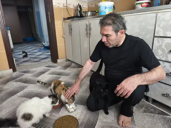 Eve gelen kedilerin tüm bakımlarını yaptığını belirten İrfan Demir, “Kapının önünde bir kediyle başladım. Ona yemini verdim, sahiplendim, oynadım. Bir baktım 2,3 derken sayıları 17’ye kadar çıktı. Natürel ki biz bundan çok mutluyuz. Çok da memnun oluyorum onları o denli görünce. İstedikleri vakit dışarı çıkıp geri gelebiliyorlar. Pencereyi açmışım onlara. İçeride sıcak bir yuva var ve bütün önlemlerimizi aldık onlar için. Mamasından, kumundan, her şeyine kadar dört dörtlük. Gelip paklığını ben yapıyorum bu ortada. Banyolarını da ben yaptırıyorum. Eğleniyorum, boş vakitlerimde gerilimimi onlarla atıyorum. Onlarla çok hoş eğlenceli vakit geçiyorum” diye konuştu.