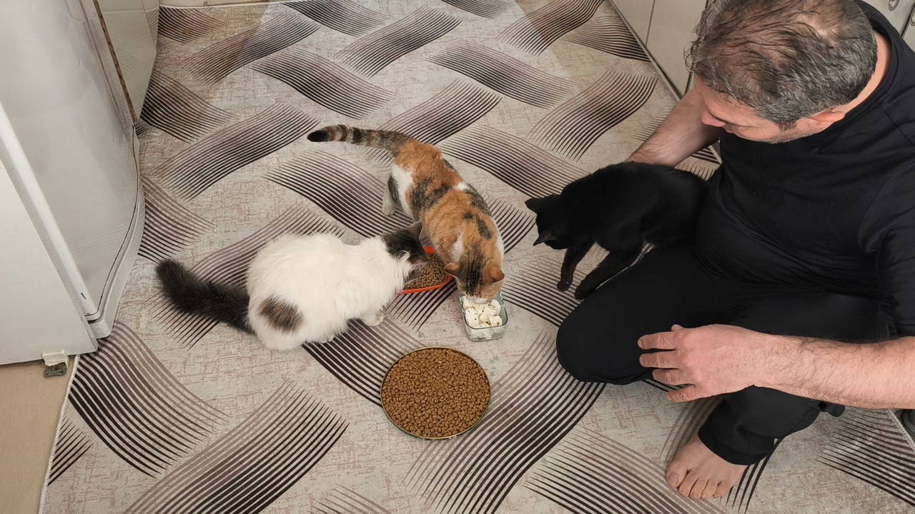 Demir ve çocukları, meskene gelen 17 sokak kedisi için mama, su ve kum hazırlayıp, kedilerin paklık ve bakımlarıyla da yakından ilgileniyor.