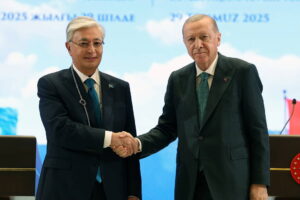 Erdoğan, Tokayev’le daha fazla ölçülerde Kazak petrolünün Türkiye üzerinden dünya pazarlarına ulaştırılmasını ve askeri ve savunma sanayi alanında işbirliğini görüştüklerini belirtti.