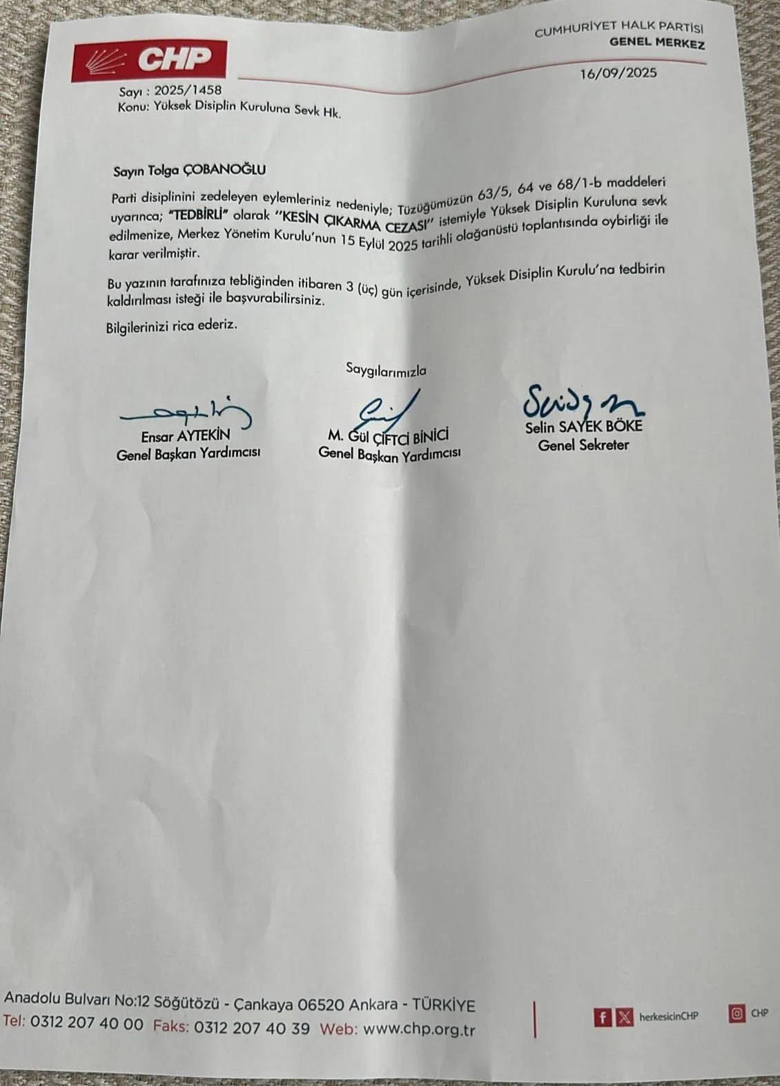 Çobanoğlu, parti disiplinini zedeleyen hareketleri nedeniyle, önlemli olarak kesin çıkarma cezası istemiyle Yüksek Disiplin Konseyi’ne sevk edildi.