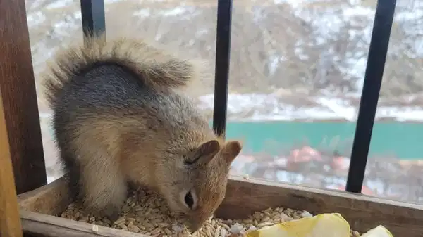 Ayhan, “Bahçeli bir meskende yaşıyorum. Don nedeniyle bu sene ağaçlarda meyve olmadı. Kış da çok ağır geçti. Yalnızca sincaplar değil; çakal, kuş, serçe, karga hepsi mağdur. Bir gün meskende otururken bir sincap geldi. Vakitle arkadaş olduk. Şu an birlikte vakit geçiriyoruz. Birbirimizi anlıyoruz. Yemeğini almaya geliyor, bu türlü vakit geçiriyoruz” dedi.