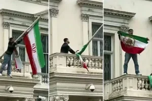 Cumartesi günü çekilen imgelerde bir kişinin büyükelçiliğin balkonunda durarak İran bayrağını indirdiği görüldü.