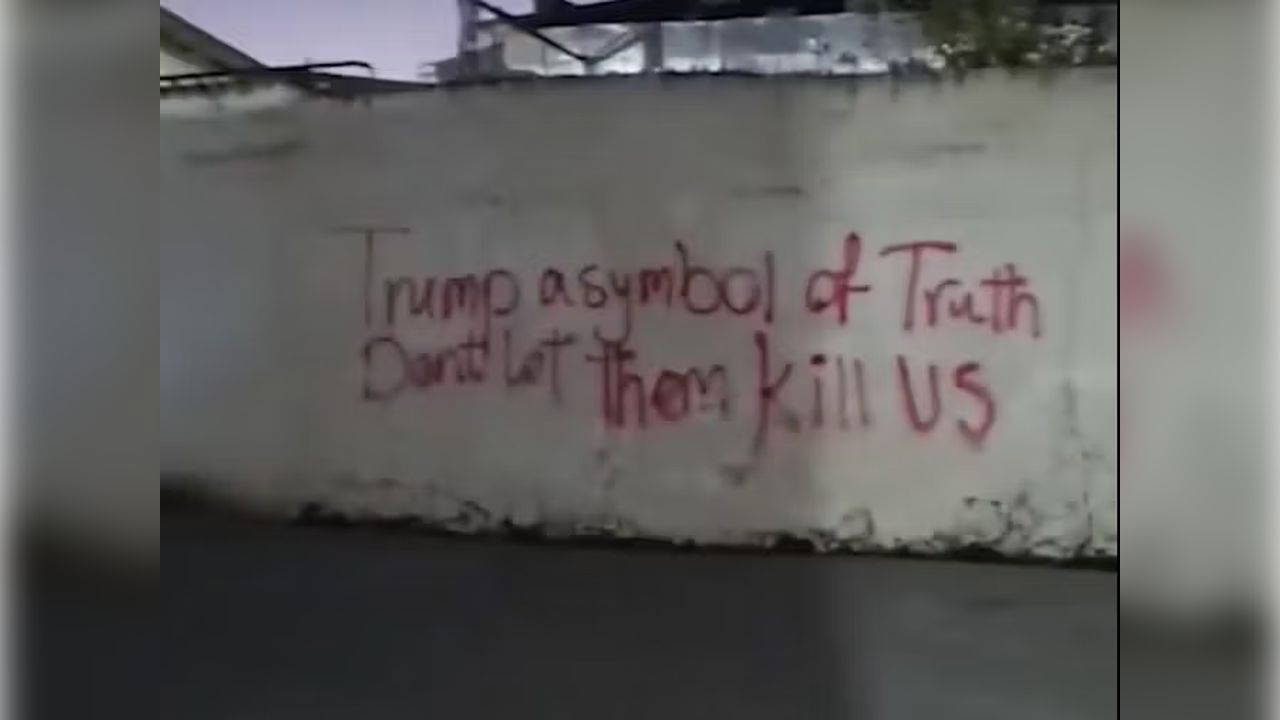 Başka bir görüntüde ise tıpkı sloganın kırmızı sprey boyayla bir duvara yazıldığı görülüyor.