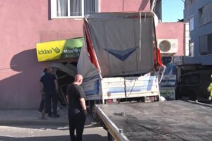 Kamyonetin şoförü Mirali Uzman, “Fren patladı, dükkanın içine girdi. Aşağıya gerçek iniyordum kurtaramadık binaya girdik” dedi.