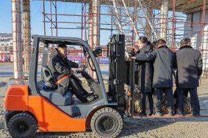 Devlet medyasında yayımlanan imgelere nazaran Kim Jong-un, emniyet kemerini takarak kullandığı forkliftle iki bayan, dört erkek, üç ağaç ve kızını kaldırdı.