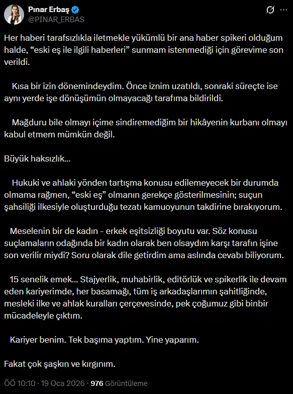 Pınar Erbaş, açıklamasında son günlerde ağır bir ruhsal süreç yaşadığını belirterek şu sözleri kullanmıştı: