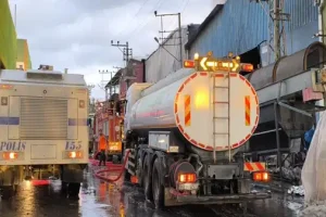 Alevlere müdahale eden gruplar, yangının etraftaki iş yerlerine sıçramaması için ağır gayret sarf ediyor.
