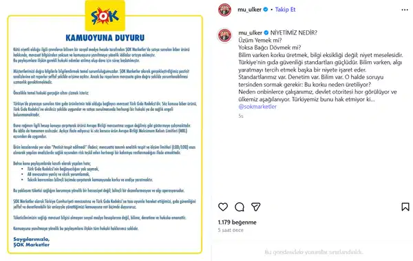 “Kötü niyetli olduğu ilgili çevrelerce bilinen bir toplumsal medya hesabı tarafından ŞOK Marketler’de satışa sunulan biber eseri hakkında, mevzuat bilgisinden mahrum ve kamuoyunu yanıltmaya yönelik argümanlar ortaya atılmıştır. Bu paylaşımlara ait gerekli türel adımlar atılmış olup dava için süreç başlatılmıştır.