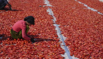 Türkiye'nin kurutulmuş domates üretim merkezlerinden İzmir'in Torbalı ilçesinde başlayan kuru domates mesaisi stant alanlarını kırmızıya bürüdü.