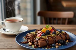 Çikolatalı krepleri muz ve çilek dilimleriyle sarabilir, üzerine çikolata sosu gezdirerek servis edebilirsiniz.
