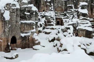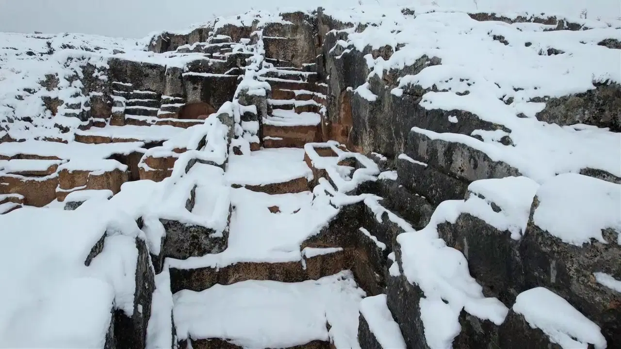 Perre Antik Kenti’nin kayalara oyulu mezar yapıları, tarihi taş yolları ve kalıntıları karla birlikte daha da dikkat cazibeli hale geldi.