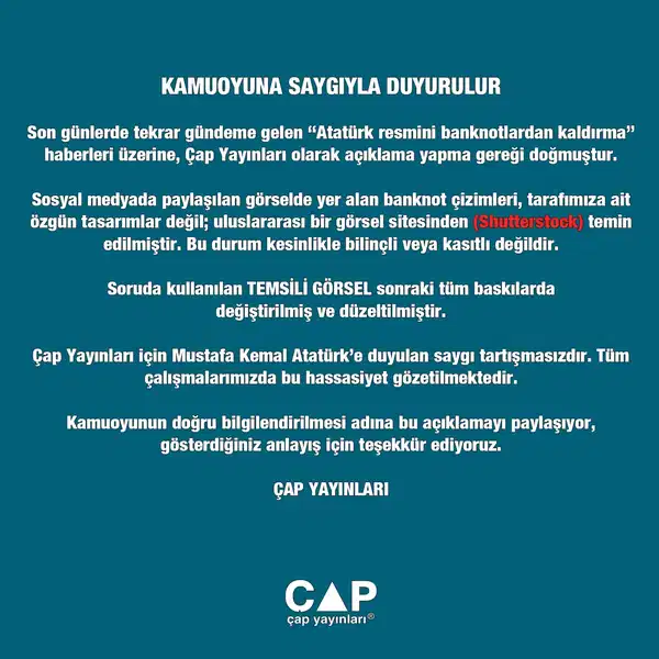 Çap Yayınları’nın açıklamasında, “Görselde yer alan banknot çizimleri, tarafımıza ilişkin özgün dizaynlar değil, memleketler arası bir görsel sitesinden (Shutterstock) temin edilmiştir. Bu durum katiyen şuurlu ya da kasıtlı değildir. Soruda kullanılan temsili görsel, sonraki tüm baskılarda değiştirilmiş ve düzeltilmiştir. Çap Yayınları için Mustafa Kemal Atatürk’e duyulan hürmet tartışmasızdır. Tüm çalışmalarımızda bu hassasiyet gözetilmektedir” denildi.