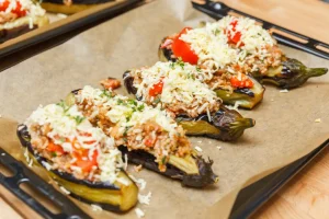 - Patlıcanların ortasını hazırlanan harçla doldurun.