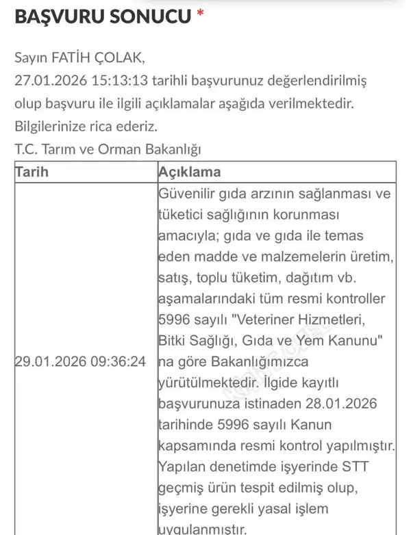 “İlgili kayıtlı müracaatınıza istinaden 28 Ocak 2026 tarihinde işletmede resmi denetim gerçekleştirilmiştir. Yapılan kontrolde iş yerinde son tüketim tarihi geçmiş eser tespit edilmiş olup, işletmeye gerekli yasal süreçler uygulanmıştır.”