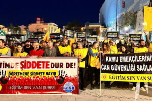 Meydanda açıklama yapan Eğitim-Sen Van Şube Eş Başkanı Murat Atabay, Van Şehit Kemal Görgülü Ortaokulu’nda iki öğretmenin okula dışarıdan giren bir kişinin saldırısına uğradığını hatırlatarak, olayın yıllardır lisana getirilen lakin görmezden gelinen güvenlik problemlerinin sonucu olduğunu söyledi.